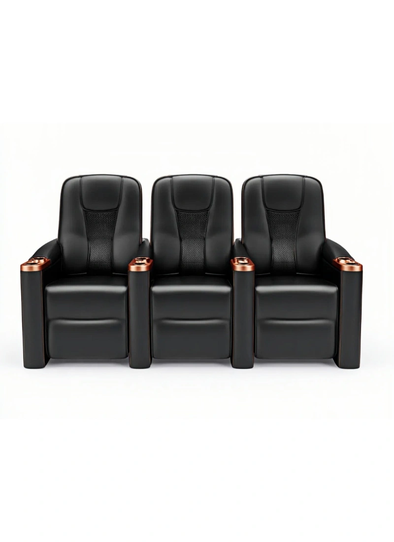 Este sofá reclinable de tres plazas está diseñado como una sola pieza para salones y espacios de entretenimiento donde se busca comodidad continua. Su estructura integrada ofrece una experiencia de asiento uniforme y una postura ergonómica en cada plaza.